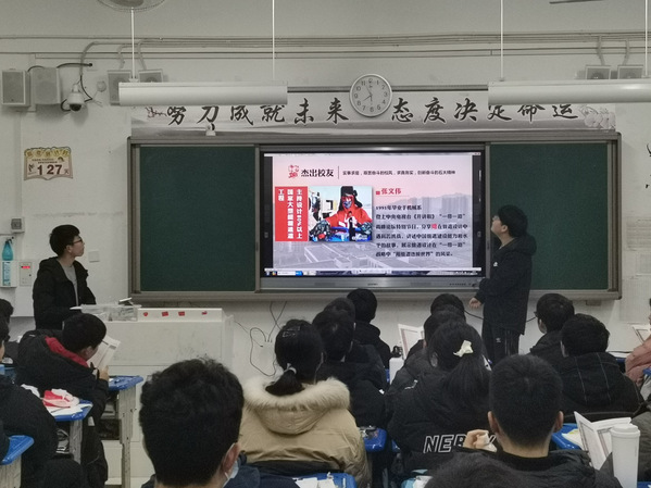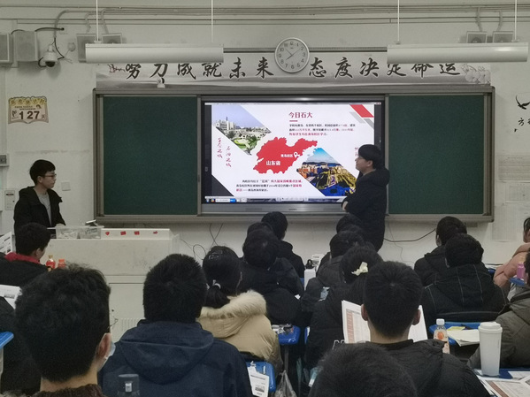 本次实践活动分为三个部分。活动伊始,实践队员向大家做自我介绍并向学生播放招生宣传视频,让他们对石大生活有简单的认识和了解。宣传片展示了石大的美丽风景,浓厚学风,凸显了惟真惟实,追求卓越的石大精神。宣讲活动第二部分是由来自石油工程学院的刘珏学生和计算机科学与技术学院的吴昊学生通过幻灯片展示更多的石大风貌和特色。队员们从初识石大,求学石大,校园生活,成就未来四个部分进行入手,着重介绍了学校特有的本研一体班,理科试验班以及依托学校平台优势给予学生学业上的支持,同时也结合自身求学经历分享了石大丰富的校园生活和文化。最后,实践队员们跟据大家提出的问题一一解答,并就高考备考做出了经验分享。