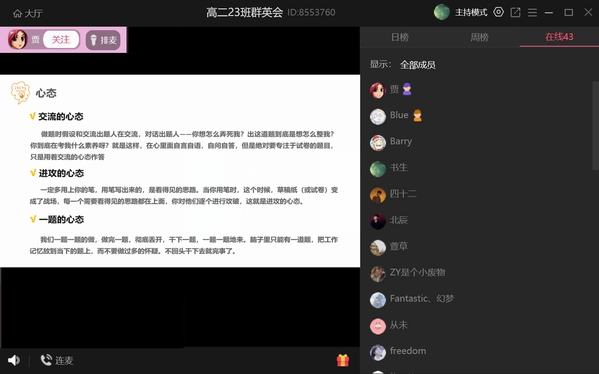 活动伊始,王子昊同学整体讲述了我校“九位一体,联动互助”的资助保障体系,对奖学金与助学金的评定标准等进行详细解读。继而,针对家庭困难的同学,介绍了助学贷款、勤工俭学岗位、学费减免、学校投保商业保险等政策。随后,对我校的总体情况进行介绍,结合往年分数线与一练排名,给予同学们一定的报考建议。最后,在高考即将来临之际,王子昊同学给同学们分享了对高考的心得感悟,提醒同学们保持身体健康,保持良好的心态,正确看待高考。
