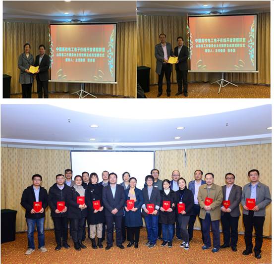 会上,张冬至教授向山东省工作委员会副主任委员、委员及秘书长、秘书颁发了EOCU联盟山东省工作委员会聘任证书。聘任仪式后,举行了“电子电气一流课程与教材建设”研讨会分会场报告。中国石油大学张冬至教授、西安电子科技大学方海燕教授、大连理工大学王宁教授、北京航空航天大学王俊教授和山东大学陈桂友教授分别作了报告。研讨会以电工电子教学改革与创新人才培养,一流课程的建设规范与教学模式改革以及信息技术与教育教学深度融合的创新与实践为主题。