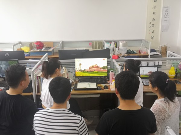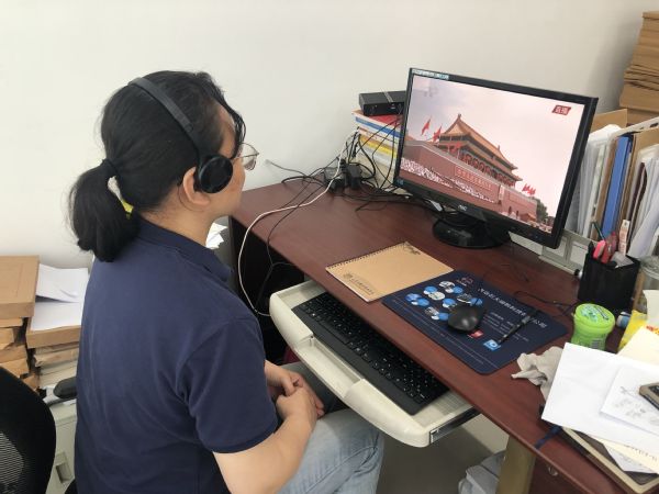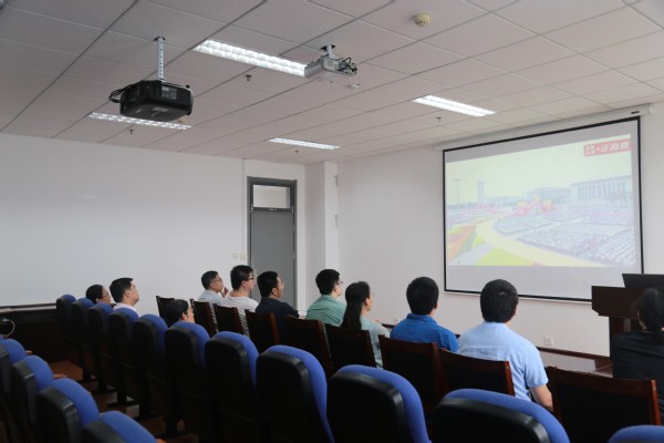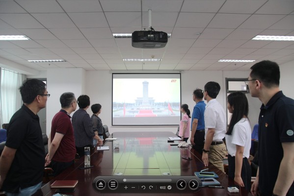 学院机关党支部全体成员于工科E1329会议室内共同收看网络直播。伴随着庄严肃穆的国歌,全体成员起立向画面内升起的国旗行注目礼。