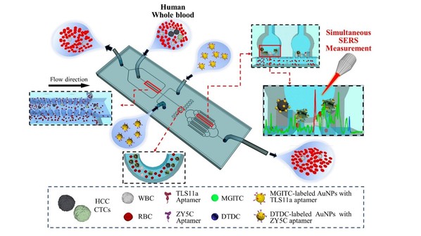 于连栋教授研究团队提出了一种基于多价适体识别技术的表面增强拉曼(SERS)-微流控芯片系统,在单细胞水平上对CTCs进行高效捕获和原位异质表型分析。其中,特殊设计的微通道包含三个功能单元:分离、捕获和原位分析单元。通过优化实验条件使该芯片的平均捕获效率达到84%,收集到的CTCs纯度高达95%,表明该系统能够从临床全血标本中高效捕获肝癌CTCs。同时,巧妙地利用SERS的“指纹图谱”特征,准确的评估临床标本中捕获到的CTCs上多种生物标志物的表达情况,以实现细胞异质性分析,这对于肝癌的早期筛查、转移和预后评估具有重要意义。