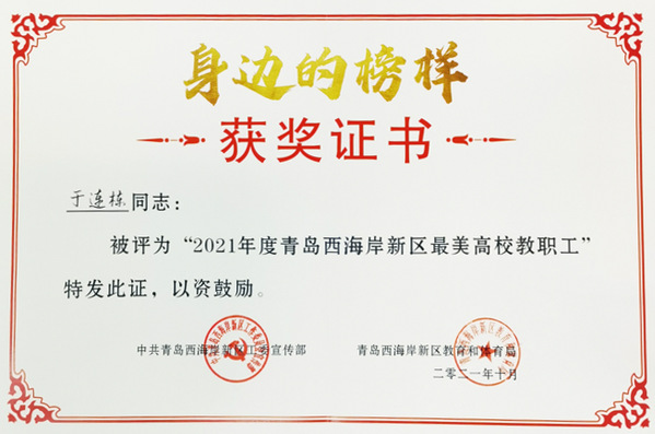 2021年10月29日,青岛西海岸新区举行了2021年度最美系列人物发布仪式,现场发布145位“最美”人物,并为获奖代表颁奖,致敬身边榜样。我院于连栋院长获评新区“最美高校教职工”,控制科学与工程学硕19级王兴伟获评“最美大学生”。