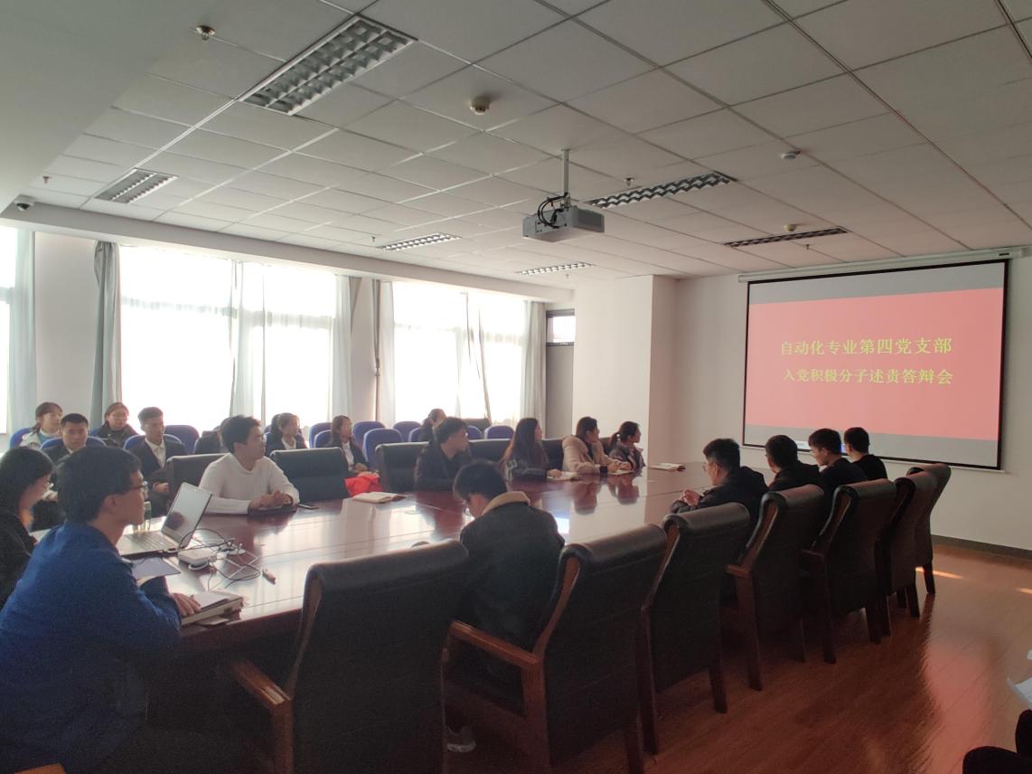 自动化专业第四党支部按照学院要求,经过前期群众意见征集和积极分子考核,确定谢清涛等4名研究生积极分子和张硕等11名本科生积极分子满足成为发展对象的基本条件,即已取得党课结业证,积极分子培养考察满一年,且“一不四合格”考核五项全部为合格。为了进一步了解积极分子同志们在这一年中的表现,更全面的考核同志们是否满足确定为发展对象的条件,特召开此次入党积极分子述责答辩会,答辩表现将作为能否最终确定为发展对象的重要参考。