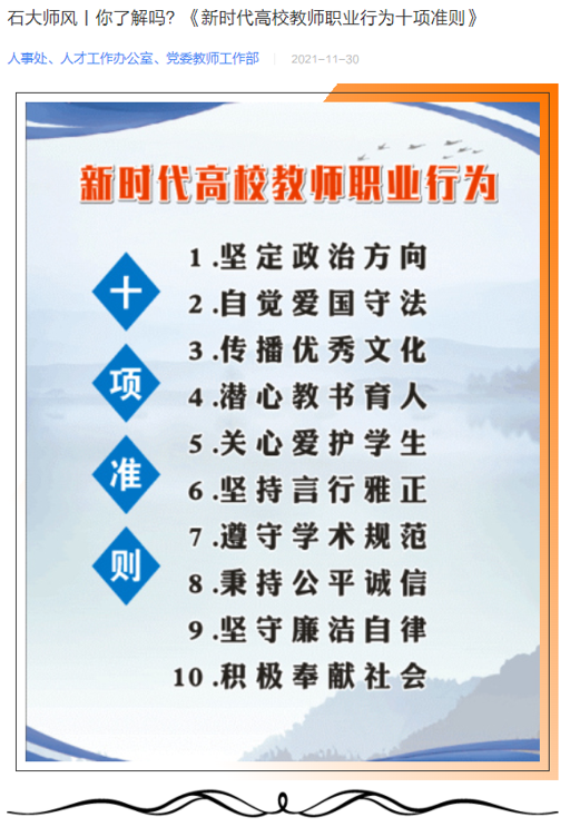 122日下午,教学中心党支部通过腾讯会议平台召开线上会议,组织党员和群众集体学习了《新时代高校教师职业行为十项准则》和教育部公开曝光的第八批违反教师职业行为十项准则的典型案例。通过学习《新时代高校教师职业行为十项准则》,不仅明确了“教师要做的事”,也警醒了“教师不得做的事”。教师们对照准则分析了教育部曝光的第八批违反教师职业行为十项准则的8起典型案例,引以为戒。