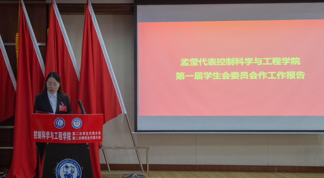 孟莹代表我院第一届学生会委员会作《不忘初心、牢记使命,锐意进取勇于担当——为建设创新驱动、特色发展的太阳集团tyc234cc贡献青春力量》的工作报告。她表示,在飘扬的思想旗帜下,未来的学生会定将全心全意为师生服务,打造学院品牌特色,为学院发展贡献青春力量。