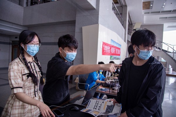 RPS战队成员结合宣传册给同学介绍机器人 魏伊婧摄