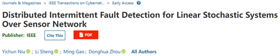 Y. Niu, L. Sheng*, M. Gao, D. Zhou*. Distributed intermittent fault detection for linear stochastic systems over sensor networks. IEEE Transactions on Cybernetics, DOI: 10.1109/TCYB.2021.3054123. (SCI 一区)