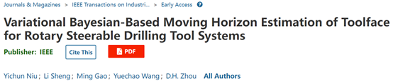 Y. Niu, L. Sheng*, M. Gao, Y. Wang, D. Zhou*. Variational Bayesian-based moving horizon estimation of Toolface for rotary steerable drilling tool systems. IEEE Transactions on Industrial Electronics, doi: 10.1109/TIE.2022.3153829. (SCI 一区)