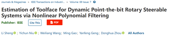 L. Sheng*, Y. Niu, W. Wang, M. Gao, Y. Geng, D. Zhou. Estimation of Toolface for dynamic point-the-bit rotary steerable systems via nonlinear polynomial filtering. IEEE Transactions on Industrial Electronics, vol. 69, no. 7, pp. 7192-7201, 2022. (SCI 一区)