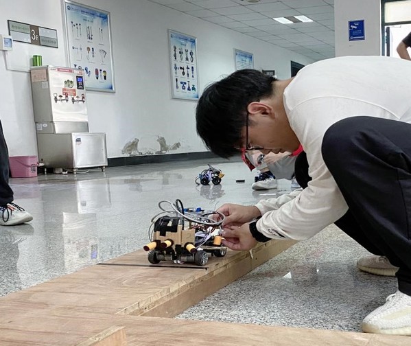 此次大赛中,同学们根据培训内容,查阅相关资料,购买比赛所用的机器人器件并组装。当问及参加比赛的初衷时,同学们表示,对机器人有浓厚兴趣,同时参加比赛也可以将理论知识与实践相结合,提高自身的能力。在备赛中遇到的许多难题,如电路连接、程序调试等,对于参赛选手而言都是一个挑战。“自己查阅文献资料、看视频,请教学长学姐,可以解决大部分问题。问题的解决让我们很有成就感!”为了这次比赛,同学们都做出了大量的努力,熬夜调试、修改代码,但是当小车在赛道上成功行进的那一刻,他们感到所有的付出都值得。