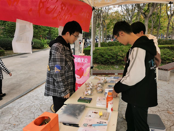 本次活动分为三部分:爱心捐赠、爱心义卖、活动抽奖。在活动中,志愿者们按时到达摊位进行志愿服务活动。为感兴趣来到摊位前的同学们仔细地讲述活动的内容以及目的并宣传了爱心捐赠以及爱心义卖的重要意义。
