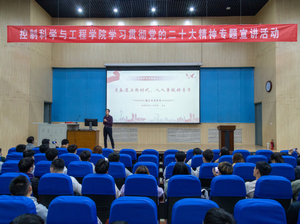 与会学生认真听取宣讲内容。会后,他们纷纷表示,当代青年生逢其时,要切实将思想和行动统一到党的二十大精神上来。学院学生会主席团成员周家聿说到:“从简单易懂的数字‘一二三’出发,姜飞老师深入浅出地讲解了中国共产党与党的二十大相关知识。作为新时代的青年,我们要学习贯彻好党的二十大精神,坚定不移听党话、跟党走,立志做有理想、敢担当、能吃苦、肯奋斗的好青年,让青春在全面建设社会主义现代化国家的火热实践中绽放绚丽之花。”