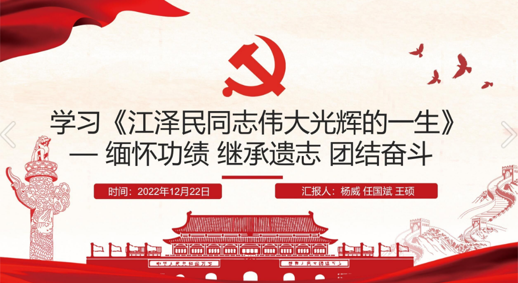 活动伊始,王硕同志向大家介绍了江泽民同志的主要经历。接着,她指出了江泽民同志在政治、经济、文化、法治、军事、社会以及祖国统一方面所做出的杰出贡献。随后,王硕同志阐述了江泽民同志在长期革命实践中锤炼出来的鲜明的革命精神和革命风范:一是目光远大,审时度势;二是信念坚定,处事果断;三是尊重实践,与时俱进;四是尊重群众,关心群众。她强调,各党员同志要努力提升自我,从实际出发,从小事做起,积极向江泽民同志学习。最后,她对本次组织活动进行总结,指出各位同志要深切缅怀江泽民同志的丰功伟绩,永远铭记江泽民同志为中国发展付出的巨大心血、打下的坚实基础、作出的突出贡献,学习和传承江泽民同志的思想、精神、风范。