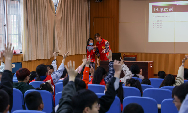 在北庄小学多功能教室,控制学院许硕向小学生们讲述五四运动的起源、意义及五四精神的内涵,大家认真倾听,体会革命先烈为了民族独立、国家富强的前仆后继、英勇奋斗。宣讲后的知识竞答环节,由大小朋友搭档参与,一人抢题、一人作答,火热的氛围让大家迅速熟识,在抢答过程中,五四精神的内容、内涵也真正入脑、入心。