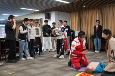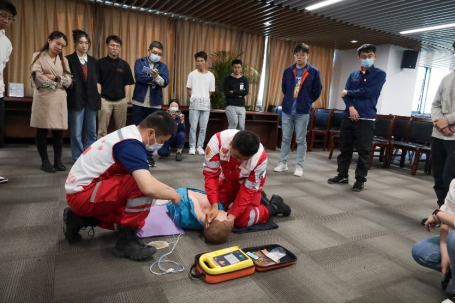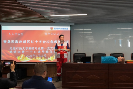活动伊始,邓世琰同志向大家介绍了基本的防灾减灾知识并播放了相关视频,强调了对待自然灾害和突发事件要未雨绸缪、提高警惕的重要性。随后,现场进行了火热的知识竞赛。本次竞赛赛制为两支部成员交替回答,回答错误即淘汰,回答正确即继续作答,坚持到最后一名的同志获得胜利。本次知识竞赛题目内容丰富、覆盖面广、科普性强,大家在答题中收获了满满的防灾减灾知识。接着,西海岸红十字会的李斌队长给测控专业第一党支部与运营一中心通号维保部支部一同进行了急救培训。李斌同志结合PPT演示,用通俗易懂的语言讲解了心肺复苏概述、评估和呼救、胸外按压、开放气道和人工呼吸、心肺复苏有效指征和终止条件、自动体外除颤器(AED机)的使用、气道异物梗阻的处置等知识。同时,利用模拟人教具对实施徒手心肺复苏的流程、技术要领进行了演示,让参会同志直观地学习掌握心肺复苏的标准操作。培训现场气氛活跃,双方支部成员相互交流学习,踊跃参加现场情景模拟操作演练。培训结束后,双方支部成员一同重温入党誓词,一句句铿锵有力的誓言回响在青岛地铁集团有限公司会议室,更加坚定了共产党人终身坚守、矢志不渝的信念。最后,测控专业第一党支部前往参观运营一中心通号维保部支部的创新工作室,学习了工作室的基本工作内容和创新模式。