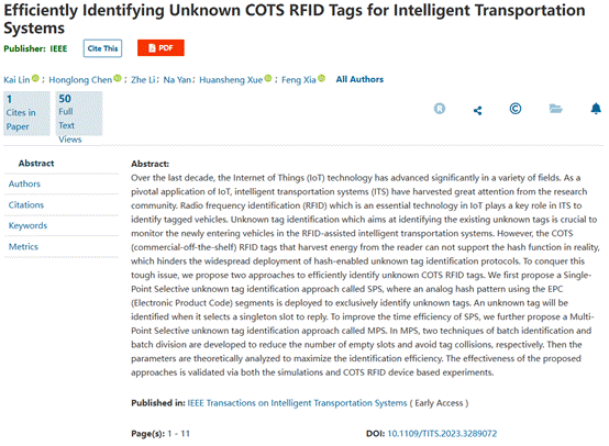 进展一:针对商用RFID标签在实际中无法支持哈希函数的问题,设计了一种类哈希模式,并通过批识别和批分解技术有效提高商用未知标签的识别效率。相关研究论文《Efficiently Identifying Unknown COTS RFID Tags for Intelligent Transportation Systems》在SCI一区TOP期刊IEEE Transactions on Intelligent Transportation Systems (TITS)上发表,该工作得到山东省优青项目、国家自然科学基金面上项目等项目的资助。我院博士生林凯为第一作者,陈鸿龙教授为通讯作者,太阳集团tyc234cc为第一署名单位。