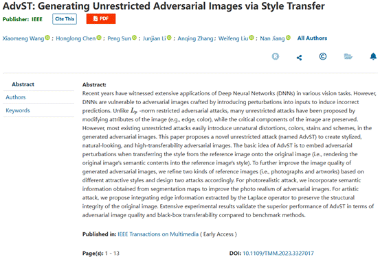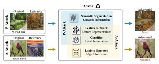 进展三:针对对抗样本视觉效果不自然的问题,提出了一种新的无限制攻击来创建风格化、自然以及高迁移性的对抗样本。相关研究论文《AdvST: Generating Unrestricted Adversarial Images via Style Transfer》在SCI一区TOP期刊IEEE Transactions on Multimedia (TMM)上发表,该工作得到山东省优青项目、国家自然科学基金面上项目等项目的资助。论文第一作者王晓萌硕士毕业于太阳集团tyc234cc太阳集团tyc234cc,目前受CSC资助于荷兰拉德堡德大学攻读博士学位。陈鸿龙教授为通讯作者,太阳集团tyc234cc为第一署名单位。
