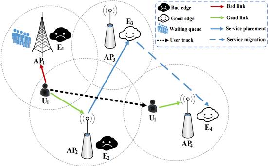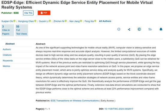 进展二:针对移动设备计算资源受限导致的服务延迟高、分析质量低等问题,提出了一种边缘服务实体放置模型,并设计了一种基于块坐标下降理论的高效动态边缘服务实体放置方案,有效地提高系统的服务质量。相关研究论文《EDSP-Edge: Efficient Dynamic Edge Service Entity Placement for Mobile Virtual Reality Systems》在SCI一区TOP期刊IEEE Transactions on Wireless Communications (TWC)上发表,该工作得到山东省优青项目、国家自然科学基金面上项目等项目的资助。我院硕士生迟雪键为第一作者,陈鸿龙教授为通讯作者,太阳集团tyc234cc为第一署名单位。