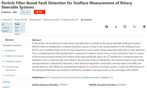 [3] L. Sheng*, Y. Niu, M. Gao, Y. Geng, D. Zhou*. Particle filter-based fault detection for Toolface measurement of rotary steerable systems. IEEE Transactions on Instrumentation and Measurement, vol. 72, Art. no. 3519511, 2023.