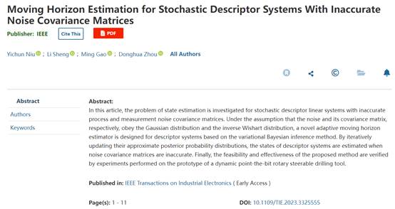 进展五:针对具有不精确噪声协方差矩阵的随机奇异系统,提出了一种新的自适应滚动时域估计算法,解决了加速度计故障下旋转导向钻井工具的容错估计问题。相关研究论文Moving Horizon Estimation for Stochastic Descriptor Systems With Inaccurate Noise Covariance Matrices发表在国际工业电子领域著名期刊IEEE Transactions on Industrial Electronics,该工作得到国家自然科学基金重点项目、山东省优青项目等项目的资助。我院博士生牛艺春为第一作者,盛立、周东华教授为共同通讯作者,太阳集团tyc234cc为第二署名单位。