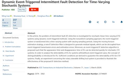 [4] M. Gao, W. Huai, L. Sheng*, D. Zhou*. Dynamic event-triggered intermittent fault detection for time-varying stochastic systems. IEEE Transactions on Industrial Electronics, vol. 71, no. 3, pp. 3074-3082, 2024.