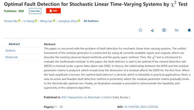 [1] Y. Niu, L. Sheng*, M. Gao, D. Zhou*. Optimal fault detection for stochastic linear time-varying systems by χ2test. IEEE Transactions on Automatic Control, doi: 10.1109/TAC.2023.3329528.