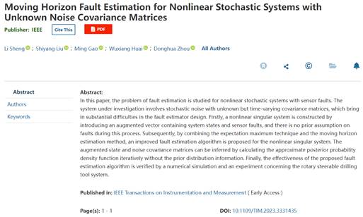 [2] L. Sheng*, S. Liu, M. Gao, W. Huai, D. Zhou*. Moving horizon fault estimation for nonlinear stochastic systems with unknown noise covariance matrices. IEEE Transactions on Instrumentation and Measurement, doi: 10.1109/TIM.2023. 3331435.