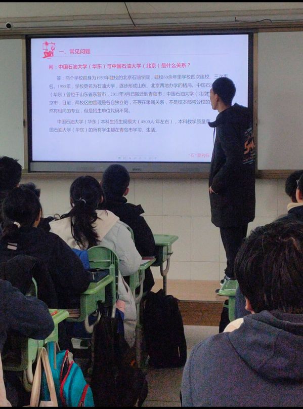 在活动过程中,宣讲队介绍了石大的光辉历史,从学科实力、专业设置、就业率与就业质量等各个方面详细阐述了石大的优势,并分享了石大丰富多彩的大学生活,最后分析了石大今年的招生计划,鼓励同学们报考石大,为实现自己的人生理想而不断奋斗。此外,宣讲队成员以“过来人”的角度向同学们讲述自己的学习方法,并分享自己高中阶段的心态变化,鼓励大家以积极乐观的态度面对高考。在最后的互动环节中,同学们积极主动的提出了自己的感想与疑惑,宣讲队成员一一进行了详细的解答。