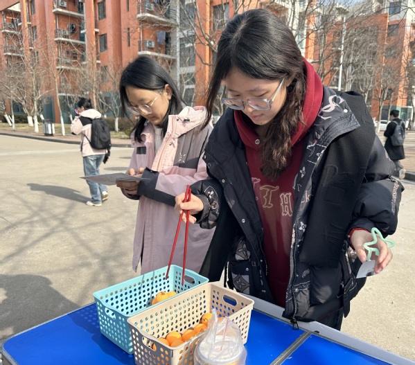 此次活动包括“猜谜语”和“乒乓球夹夹乐”两个部分。在“猜谜语”环节中,同学们开动脑筋,凭借自己的独特的想象力及创造性的思维,根据卡片上提供的文字内容,敏锐理解,进行答题,现场气氛火热;在“乒乓球夹夹乐”环节中,同学们展现出心灵手巧、反应迅速的一面,用筷子将乒乓球夹到指定的盆中,每一次成功的夹球都伴随着欢呼声和掌声,现场洋溢着无限的欢乐与挑战精神。每一位参与的同学,都沉浸在愉悦的氛围中,收获了小礼物,尽情享受着这一美好时刻。