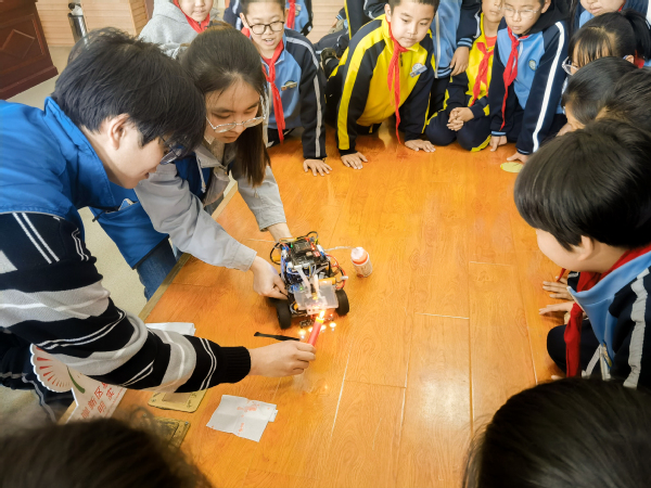 活动开始,本研电信2101的范悦仪与王文昊用“小车的轮子数量与功能”与四年级的小朋友进行互动,并围绕科技创新和未来科技发展趋势进行了生动有趣的讲解,随后向大家展示了双创中心的智能避障小车和智能灭火小车,在他们的耐心讲解与演示之下,小朋友们对智能小车有了初步的了解。在有了基础了解之后,王文昊邀请小朋友们参与到小车的启动与功能应用的演示当中,小朋友们展现了极大的兴趣与好奇,纷纷参与其中。最后,张亚辉同学进行活动总结,对孩子们的表现表示赞赏和鼓励,希望他们能够继续保持对科技的热爱和探索精神,为未来的科技创新做出贡献。