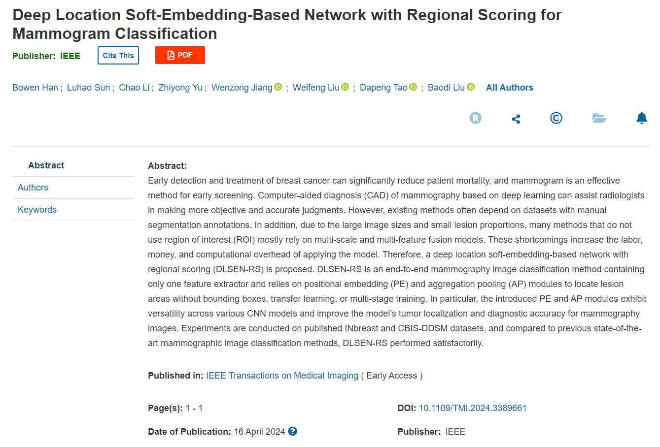 近日,我院刘伟锋教授团队在乳腺癌钼靶图像分类方面取得新进展,相关研究论文《Deep Location Soft-Embedding-Based Network with Regional Scoring for Mammogram Classification》在医学成像领域国际顶级期刊IEEE Transactions on Medical Imaging (IEEE TMI)上发表,该工作是与山东省肿瘤医院乳腺科合作完成,是人工智能与乳腺癌诊断的结合。我院刘宝弟副教授为通讯作者,2018级本研生韩博文和山东肿瘤医院2021级研究生孙芦浩为共同第一作者,太阳集团tyc234cc为第一署名单位。