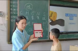 实践队队员为孩子们讲解石油分馏及产物——聂恩平摄 课堂上同学们踊跃回答问题——聂恩平摄