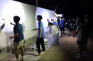 实践队夜晚进行墙绘——聂恩平摄 实践队队员们和孩子一起进行公益墙绘——聂恩平摄