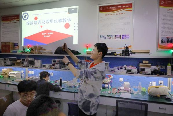图2 张博麟学长为大家介绍焊接工具 蔡佳怡摄