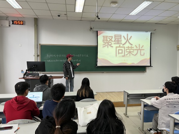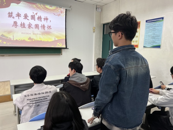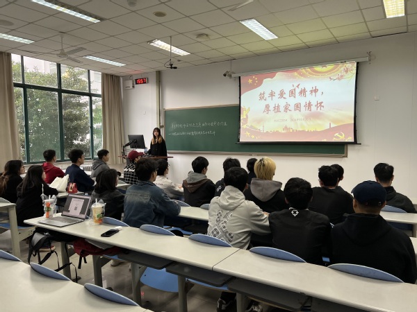 为加强青少年的爱国主义精神以及深厚的家国情怀,庆祝祖国七十五周年华诞,测控2202团支部联合控院学生会于2024年10月20日下午,在南堂104举办以“筑牢爱国精神,厚植家国情怀”为主题的团日活动,青马燎原宣讲团的成员翟佳羽担任本次团日活动的嘉宾,测控2202的团支书甘雨禾担任本次团日活动的主持人。