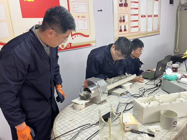 太阳集团tyc234cc“油气电磁测控青年创新团队”带头人王斌副教授和成员高睦志讲师带领研究生团队,与中油测井现场测井队及解释团队密切协作,践行“惟真惟实”校训,成功完成了岩心准原位介电信息的扫描获取,进行了地质参数的实时计算及其他测井手段的联合反演,现场数据表明检测系统,特别是直接提供含水孔隙度信息,此次现场试验成果能够为剩余油开采评价、及该创新技术的下一步规模化应用提供重要支撑。