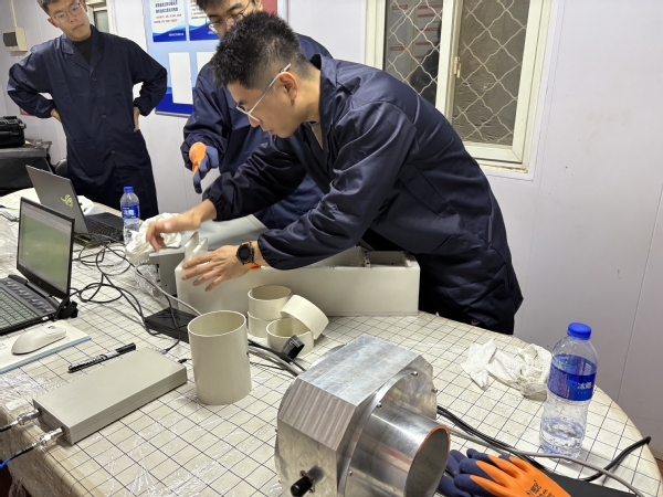 中国石油天然气集团有限公司高级专家于2024年牵头设立《移动式全直径岩心介电测量装置研发与解释研究》项目,受到集团高层的重视。为达到对剩余油、页岩油高效开发利用的目标,重点攻关下一代岩心分析技术,集团指定中国石油集团测井有限公司与我校开展响应机理、关键传感器、解释方法等全方位的产学研合作。基于微波介电的全尺寸岩心高灵敏分析新技术的相关研究和仪器研制,是由国家自然科学基金和中石油测井联合资助实施,基于微波对材料极化特性的传感原理,攻关全尺寸岩心微波复介电超灵敏传感难题,利用电磁传输/反射特性差异对深地岩心样本的含水孔隙度、可动水孔隙度等关键测井参数直接定量评价。本次现场验证,是在前期青创团队与中油测井解释团队合作、完成关键原理研究及系统样机研制和实验室标定的基础上,不仅对自研仪器装备进行了功能性测试,还在取芯第一时间对片区多个主力层开展了数据采集和科学考察,验证了关键传感器对密闭取芯样品参数有效响应能力和设计的科学合理性,这将为中晚期油田的多物理量测井解释、剩余油开发和水淹评价等提供重要支撑。