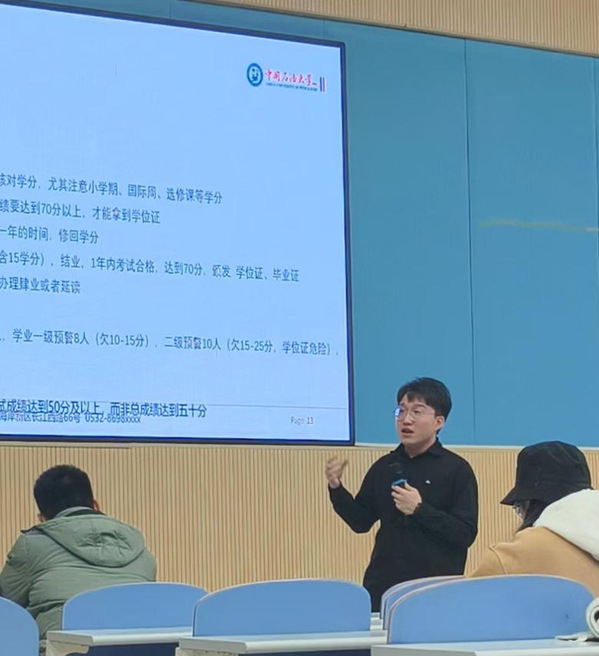 首先,赵文豪老师就校园安全、日常管理、毕业去向以及毕业要求进行了详细讲解。赵老师详细阐明了“毕业证、学位证、结业证、肄业证”的区别及获取要求,同时提醒未达到学士学位获取要求的学生,抓紧毕业的尾巴,努力完善自身学业,尤其对必修学分和第二课堂进展不够的同学提出要求,有困难及时反馈;校园安全方面,赵老师强调了校规校纪、校园安全等事项,提醒同学们在校期间要严格请销假制度,重视宿舍安全问题,并部署各班级、各宿舍配合辅导员助理做好晚点名和零汇报工作,严格遵守学校管理规定;提醒大家在毕业考察、实习、求职、外出学习过程中要注意交通安全、人身安全和财产安全,在积极求职的同时要保障好个人权益,切实增强防诈骗意识。
