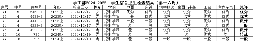 控制学院优良舍风建设小组检查结果(第十六周):