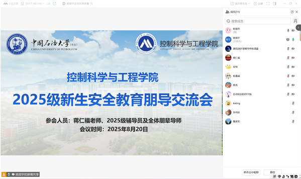 此次线上主题班会的开展,明确了朋辈导师的工作重点与方向的同时也为2025级新生入学筑牢了安全防线,帮助新生提前了解大学学习生活的关键信息,有效缓解了新生的入学焦虑,为学院后续迎新工作的有序推进与新生顺利融入大学生活提供了有力保障。