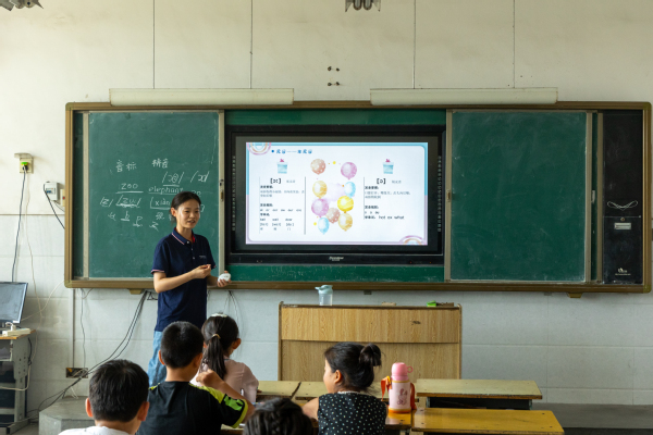 图二 实践队队员给学生们讲解音标 刘瀚文摄