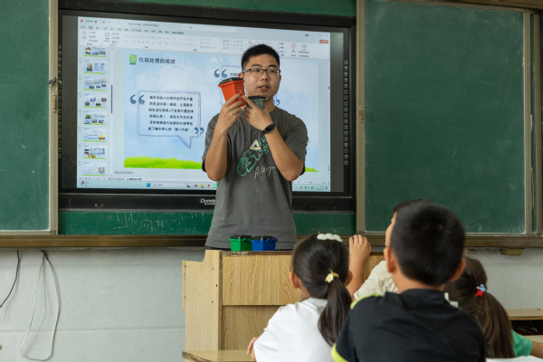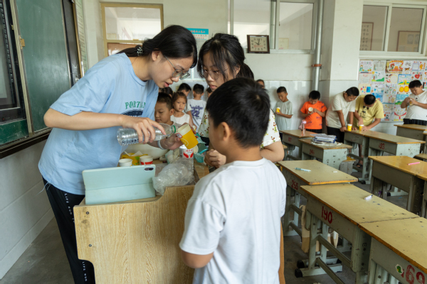 同时,实践队还开设了特色课程,激发学生们的学习兴趣。“趣味历史” 通过生动故事让孩子们感受历史的魅力;“世界文化之旅” 带领孩子们了解亚洲周边国家的风土人情,拓宽了国际视野;“生物与自然” 课程中,队员们带领孩子体验亲手培育豆芽的乐趣;环保课上,队员们用自制的迷你分类垃圾桶和垃圾卡片道具,结合幽默的讲解方式,让垃圾分类知识变得通俗易懂。