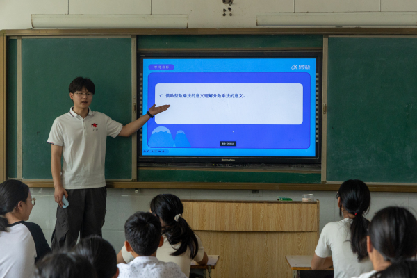 图一 实践队队员给学生们讲解分数的概念 刘瀚文摄