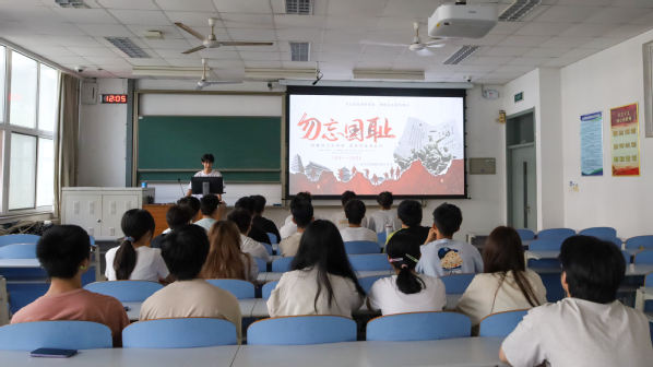 视频结束后,班长朱俊豪从历史脉络、侵华暴行、英烈事迹三方面展开讲解。他带领全班面向活动展示的宣誓词,以“勿忘国殇,珍爱和平!振兴中华,吾辈自强!”的铿锵誓言,立下传承爱国精神、勇担时代使命的承诺。