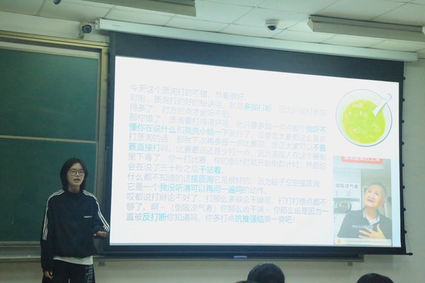 校辩论队队长周婧则重点阐释了三辩在辩论场上的核心作用,包括如何通过有效盘问推进战场、捕捉逻辑漏洞,以及如何在高速交锋中把握节奏、实施攻防转换。最后,张添策深入讲解了作为四辩总结陈词的策略与价值。他强调四辩须具备全局视角,能够在赛末梳理整场脉络,回应关键交锋,并实现理论层面的升华,从而有力巩固本方立场。