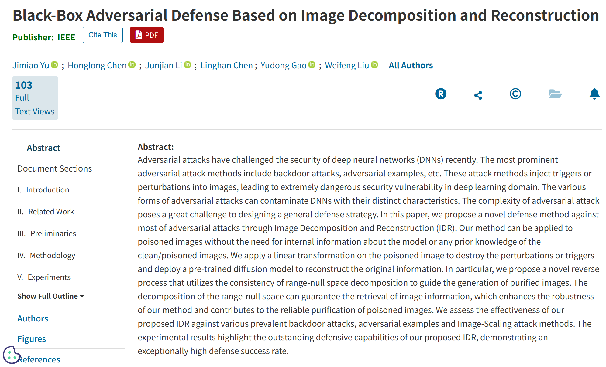 陈鸿龙教授团队在人工智能安全方面取得进展,相关研究成果Black-Box Adversarial Defense Based on Image Decomposition and Reconstruction发表在《IEEE Transactions on Multimedia》。《IEEE Transactions on Multimedia》是计算机视觉领域的国际知名期刊,目前影响因子为8.4(SCI一区)。论文第一作者为余继淼,通讯作者为陈鸿龙教授,太阳集团tyc234cc为唯一署名单位和通讯单位,该研究得到山东省自然科学基金(项目编号:ZR2022YQ61)的资助支持。