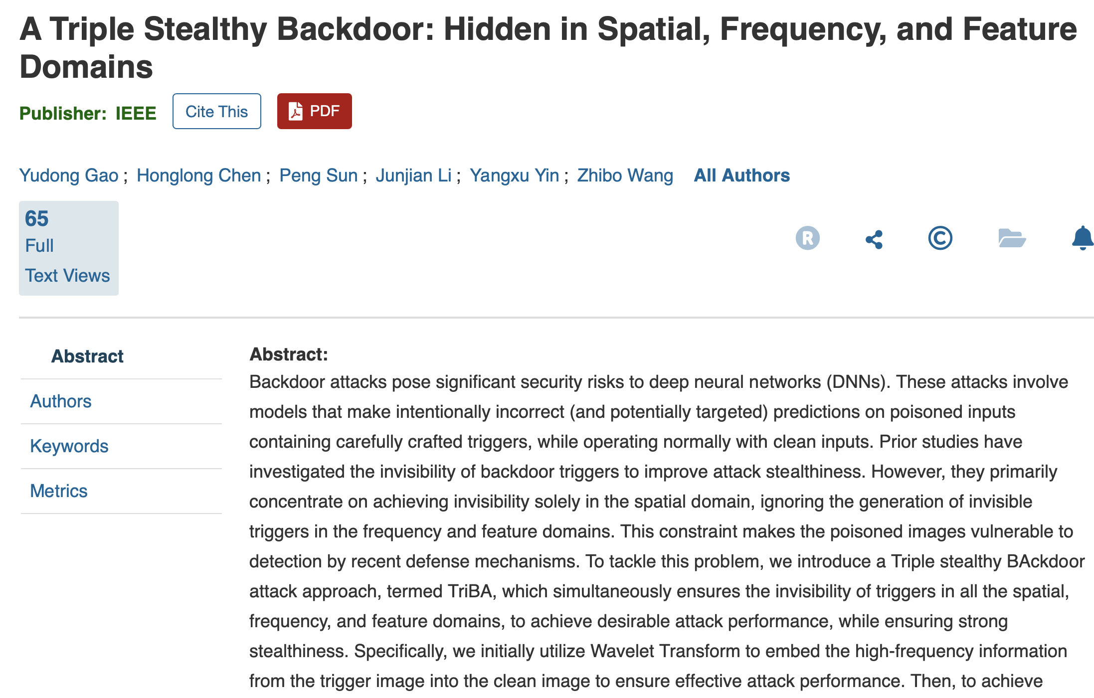 陈鸿龙教授团队在深度神经网络后门攻击防御方面取得重要进展,相关研究成果《A Triple Stealthy Backdoor: Hidden in Spatial, Frequency, and Feature Domains》一种三重隐形后门:隐藏在空间域、频率域和特征域)发表在国际顶级期刊《IEEE Transactions on Dependable and Secure Computing》。《IEEE Transactions on Dependable and Secure Computing》是计算机安全与可信计算领域的国际权威期刊,为CCF A类推荐期刊。论文第一作者为控制科学与工程专业2023级(本研19级)硕士研究生高宇栋,通讯作者为陈鸿龙教授,太阳集团tyc234cc为第一署名单位和通讯单位,该研究得到山东省泰山学者青年专家项目(项目编号:tsqn202312133)、国家自然科学基金(项目编号:61772551、62111530052)以及山东省自然科学基金(项目编号:ZR2022YQ61)的资助支持。