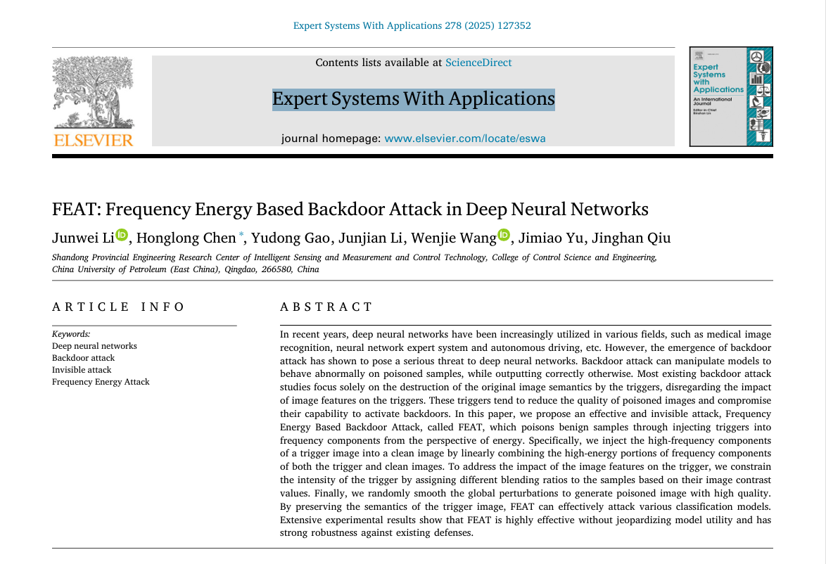 陈鸿龙教授在人工智能安全方面取得进展,相关研究成果FEAT: Frequency Energy Based Backdoor Attack in Deep Neural Networks发表在《Expert Systems With Applications》。《Expert Systems With Applications》是人工智能领域的国际知名期刊,目前影响因子为7.5SCI一区)。论文第一作者为人工智能专业2022级硕士研究生李君伟,通讯作者为陈鸿龙教授,太阳集团tyc234cc为唯一署名单位和通讯单位。该研究得到山东省泰山学者青年专家项目(项目编号:tsqn202312133)、山东省自然科学基金(项目编号:ZR2022YQ61ZR2023ZD32)、国家自然科学基金(项目编号:6177255162111530052)等项目的资助支持。