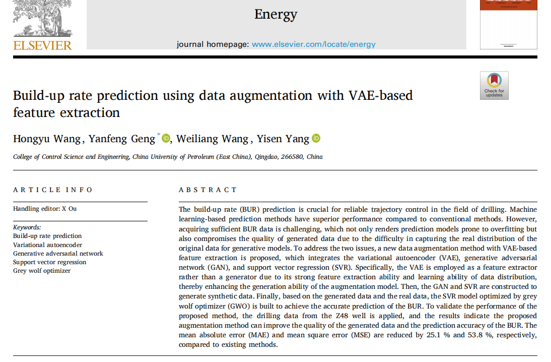 近日,我院控制科学与工程专业2022级博士研究生王洪玉在钻井轨迹预测方面取得进展,相关研究成果Build-up rate prediction using data augmentation with VAE-based feature extraction发表在《energy》。《energy》是能源领域的国际知名期刊,目前影响因子为9.4(SCI一区)。论文第一作者为王洪玉,通讯作者为耿艳峰教授,太阳集团tyc234cc为唯一署名单位和通讯单位。