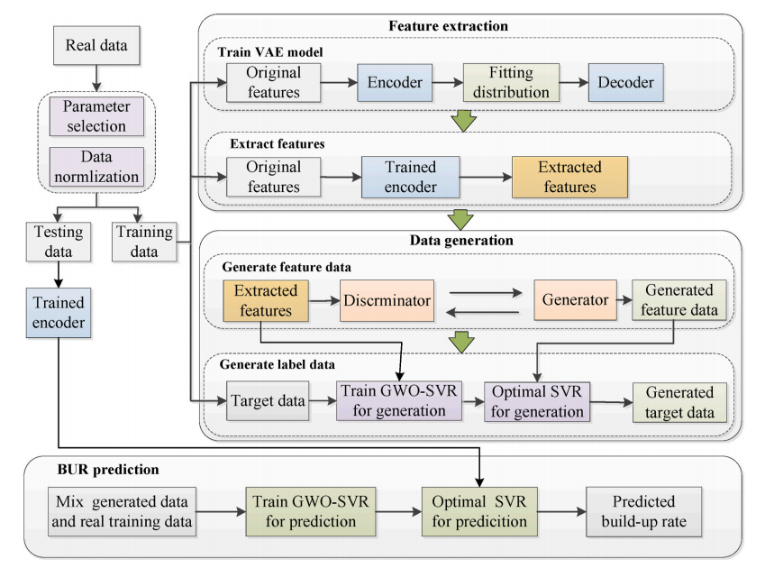 在钻井领域中,造斜率(BUR)的预测在钻井轨迹控制中发挥着重要作用。与传统的方法相比,基于机器学习的预测方法具有更优的性能。然而,实际中很难获取足够的预测数据。它不仅使得预测模型易过拟合,且由于无法捕获到原始数据的真实分布,影响了生成数据的质量。为解决该问题,本文提出了一种新的数据扩充的方法。该方法利用VAE提取原始数据的特征,同时结合生成对抗网络(GAN)和支持向量回归(SVR)来生成数据以及进行BUR预测。具体来说,由于VAE较强的特征提取能力以及数据分布的学习能力,在该方法中,VAE被用于特征器而不是生成器,来增强扩充模型的生成能力。然后,基于提取的特征,建立GAN以及SVR模型来生成数据。最终,利用生成数据以及真实数据,建立基于灰狼优化器(GWO)优化的SVR模型进行造斜率的精准预测。为验证该模型的性能,采用了Z48井的数据。结果表明,该方法能够提高生成数据的质量以及BUR的预测精度。与现有方法相比,平均绝对误差(MAE)和均方误差(MSE)分别减少了25.1%和53.8%。